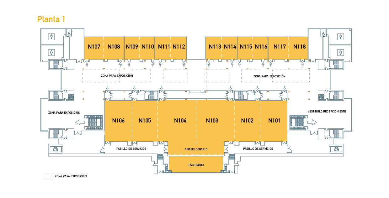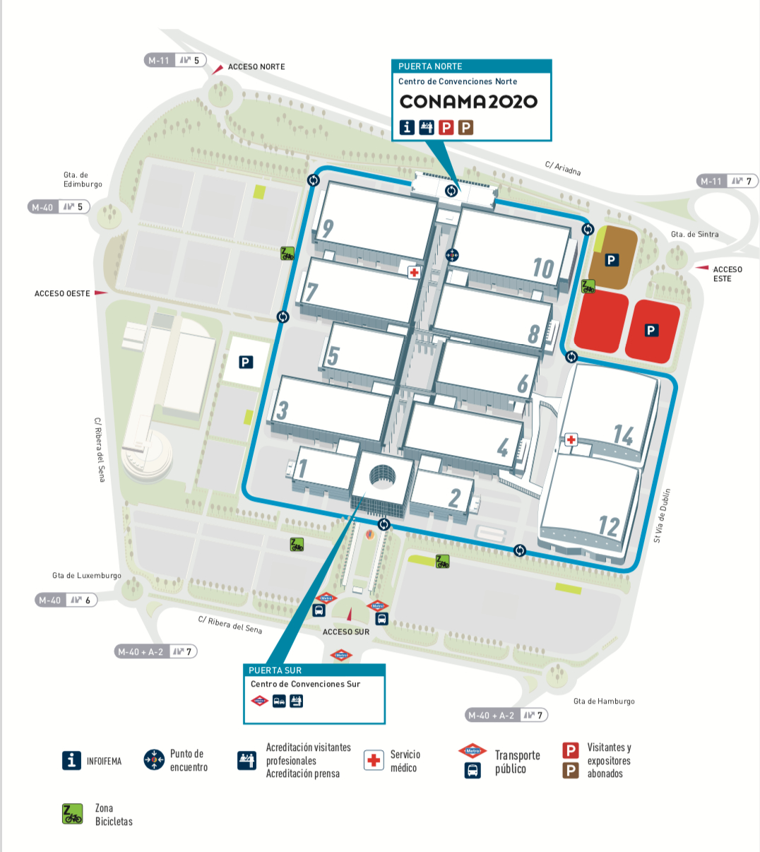 Cuando hayas llegado a la zona norte, sube a la planta 1. Es aquí donde se celebra Conama 2020. En este plano puedes ver las salas donde tendrán lugar las sesiones del congreso. Recuerda que tienes que reservar tus sesiones para poder acceder, debido a las restricciones de aforo COVID-19.
